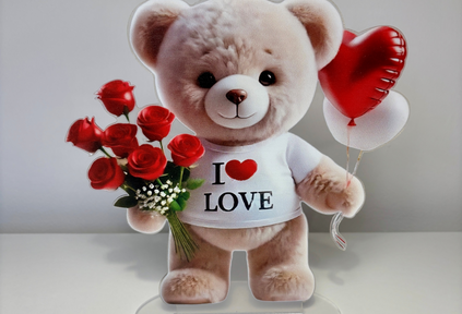 This cute teddy with I Love printed on his t-shirt & holding red roses & balloon is a 2D acrylic shaped picture on a stand